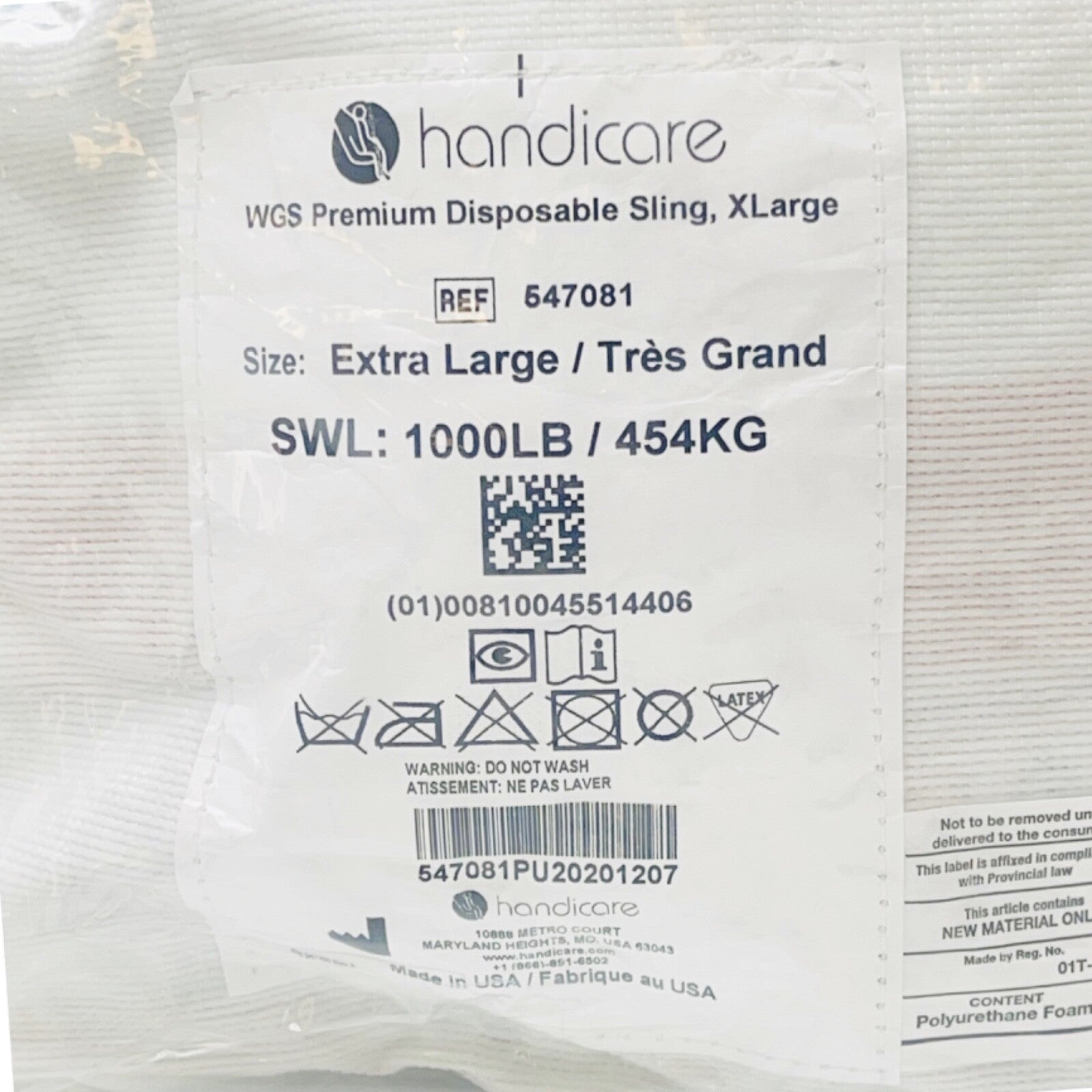 HANDICARE REF 547081 WGS Premium Disposable Sling, X Large, SWL: 1000LB / 454KG